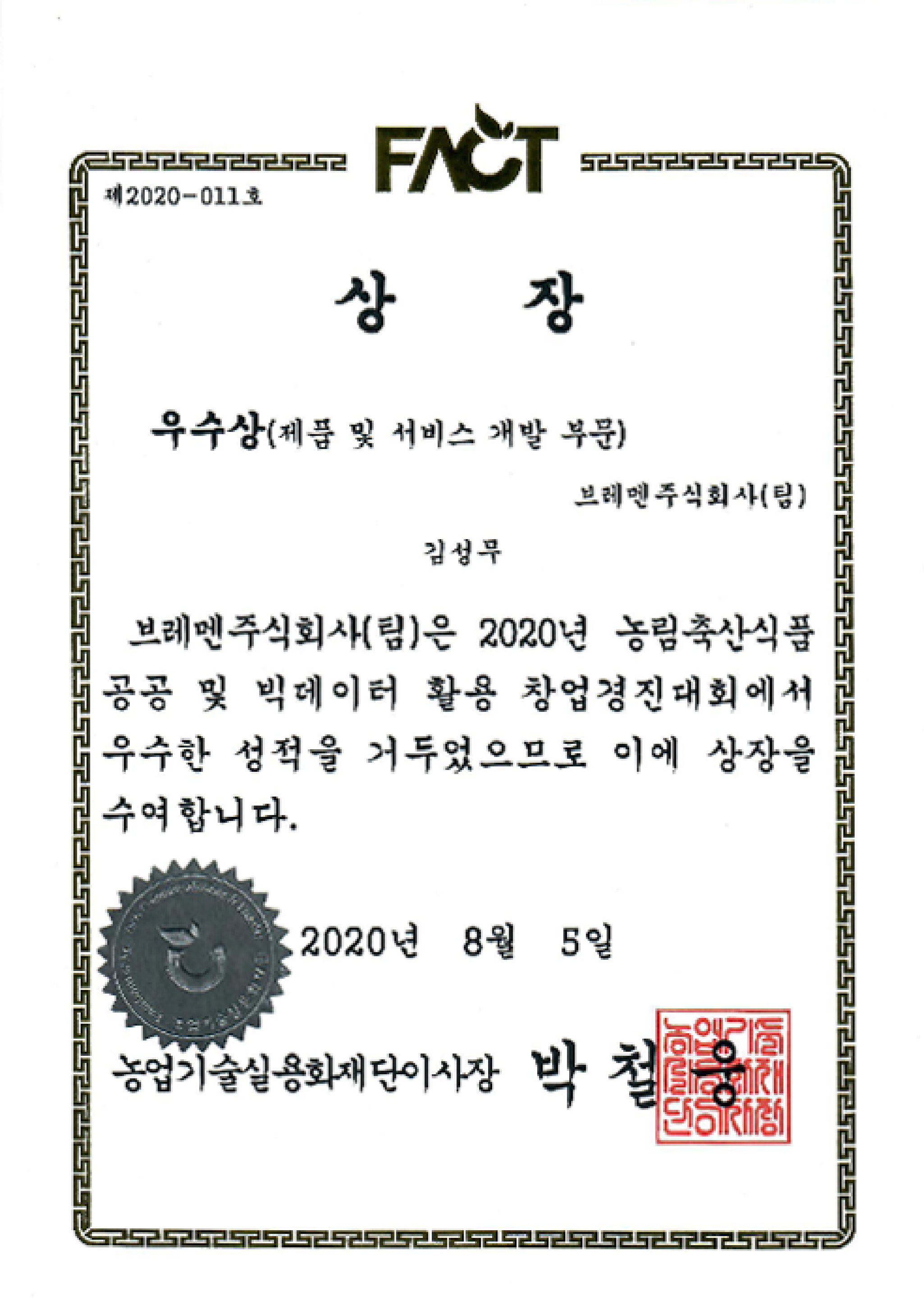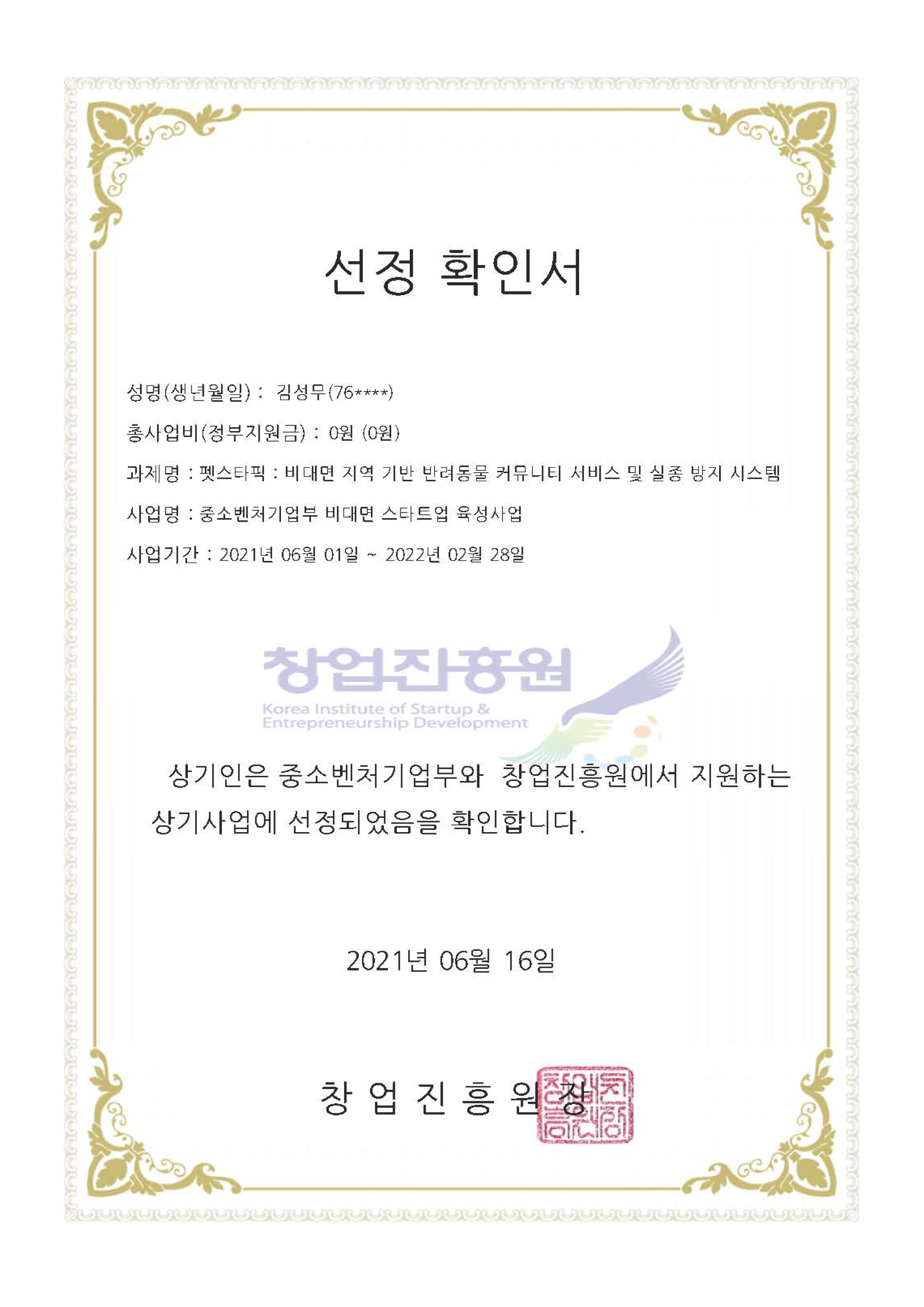 Selected for the 2022 Small Business Technology Commercialization Capacity Enhancement Program by the Small and Medium Business CorporationRecognized as an Outstanding Company in the 2021 Non-Face-to-Face Startup Development Program by the Korea Agricultural Technology Promotion AgencyRegistered as a Venture Company (Registration No. 20220928030078)Selected as a Partner Company (Selection No. 2022-98)Awarded the Gyeonggi Regional Small and Medium Venture Business Administration Director’s Prize at the Gyeonggi Small Business Cross-Industry Convergence Plaza Competition※ Participated in the 2022 GDPP Cat Festa (Sept. 23–25, 2022) and 2022 Mega Zoo Expo (Nov. 18–20, 2022)