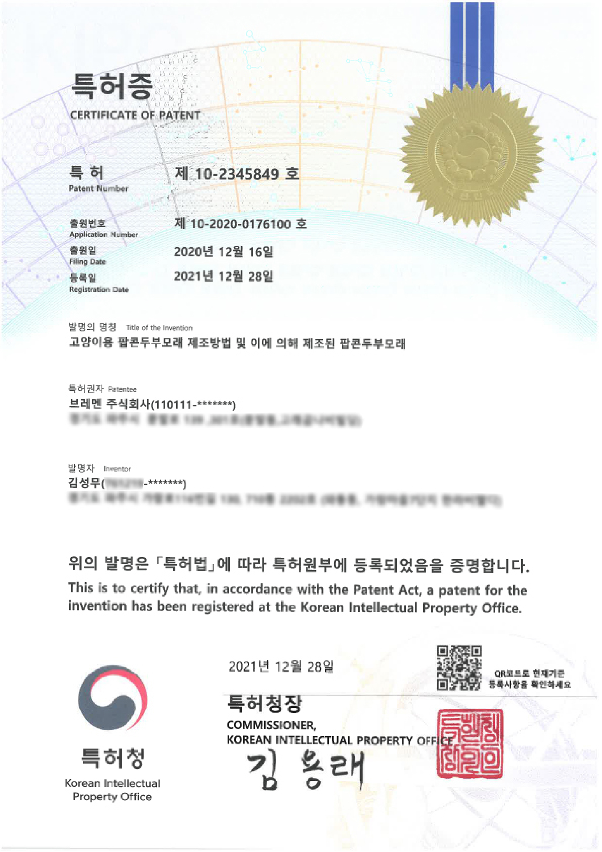 Successfully completed 2nd round of ‘Wadiz’ crowdfunding for Bremen Popcorn Tofu Cat Litter (2,779% funded)Entered into a sales agreement with ‘LocknLock’ Germany for European Amazon distributionSelected for the Korean Ministry of SMEs and Startups’ Non- Contact Startup Support ProgramSuccessfully funded on Japan’s ‘Makuake’ platform (1,543% achieved)Launched a pet platform in partnership with Shinhan Bank (Jun 2021 – Aug 2022)Patent registered: Method for manufacturing popcorn tofu cat litter and the product thereof (Patent No. 10-2345849)