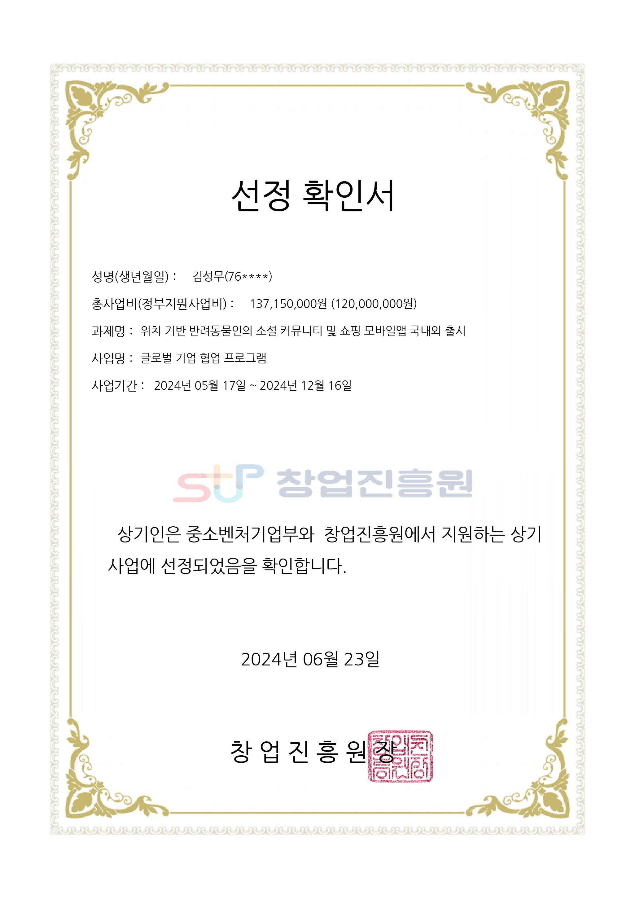 Selected for the Global Collaboration Program by the Ministry of SMEs and StartupsParticipated in Techsauce 2024 IT Exhibition (Aug. 7–9) and Pet Fair SEA 2024 (Oct. 30–Nov. 1) in Bangkok, Thailand.Certified as a Family-Friendly Company by the Ministry of Gender Equality and Family (No. 2024-0459)